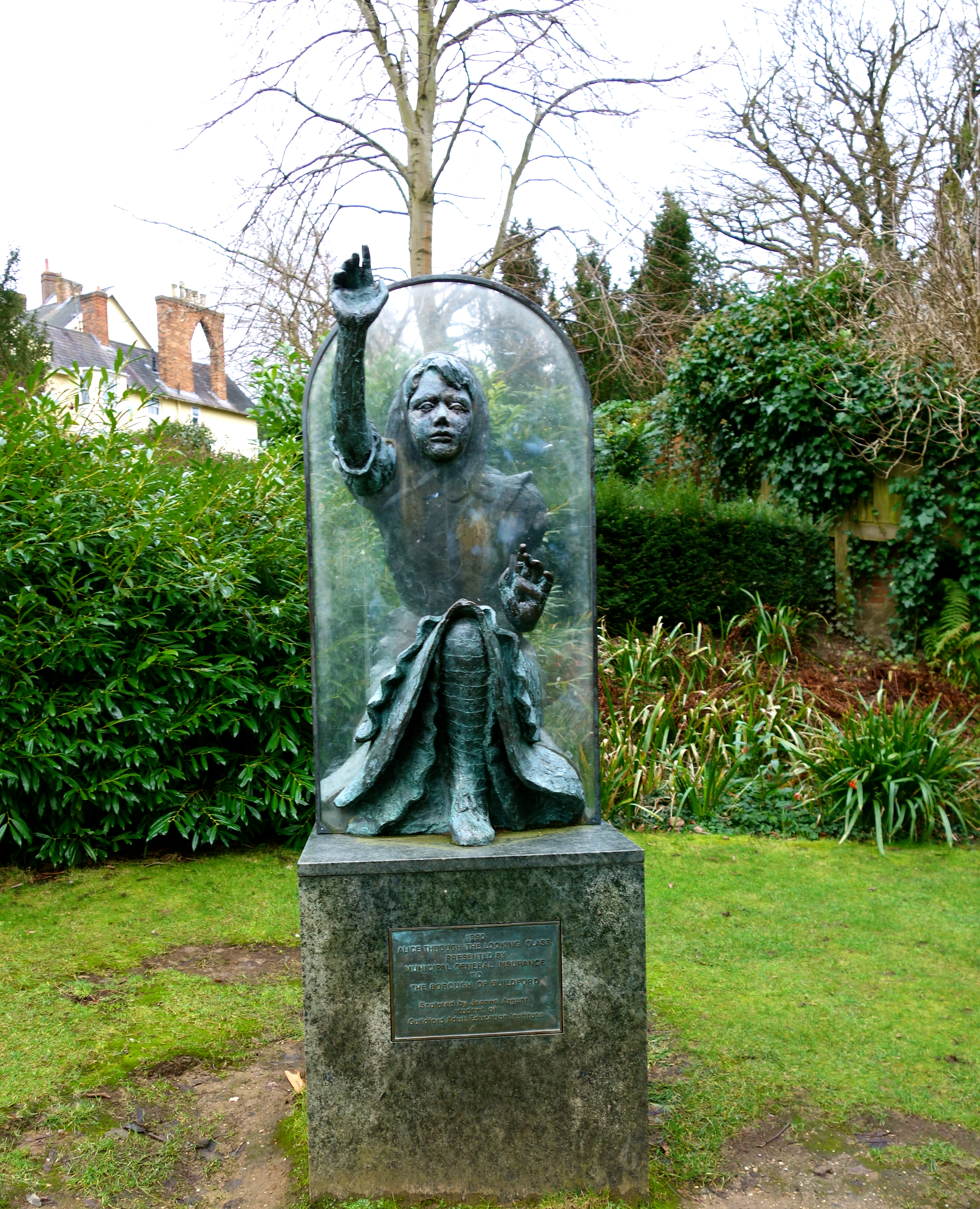 Jeanne Argent made this statue of Alice passing through the looking glass in 1990 as a symbol for the link between Lewis Carroll and Guildford. The statue stands in what was the garden of Castle Gate with Guildford’s magnificent castle overlooking the grounds.