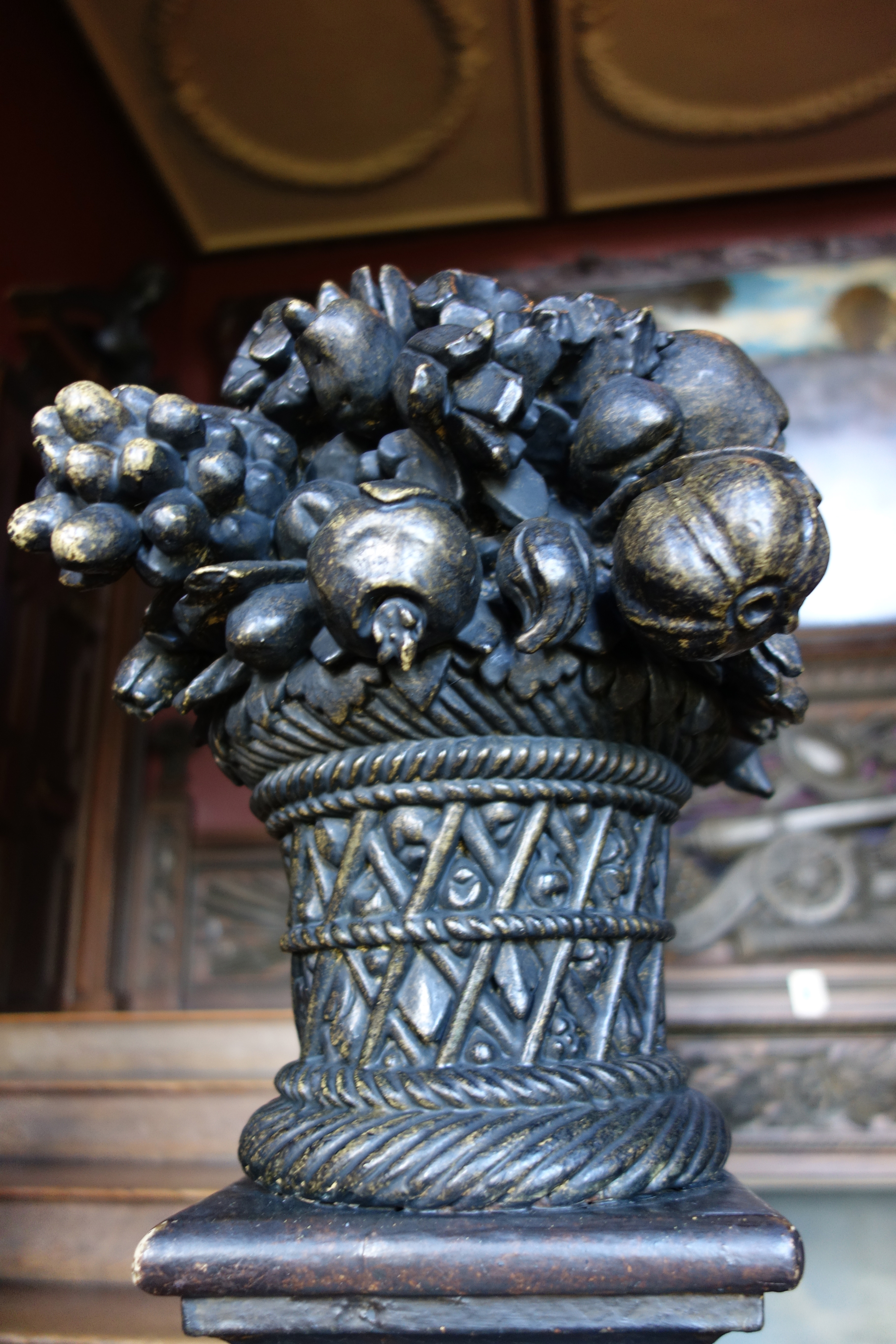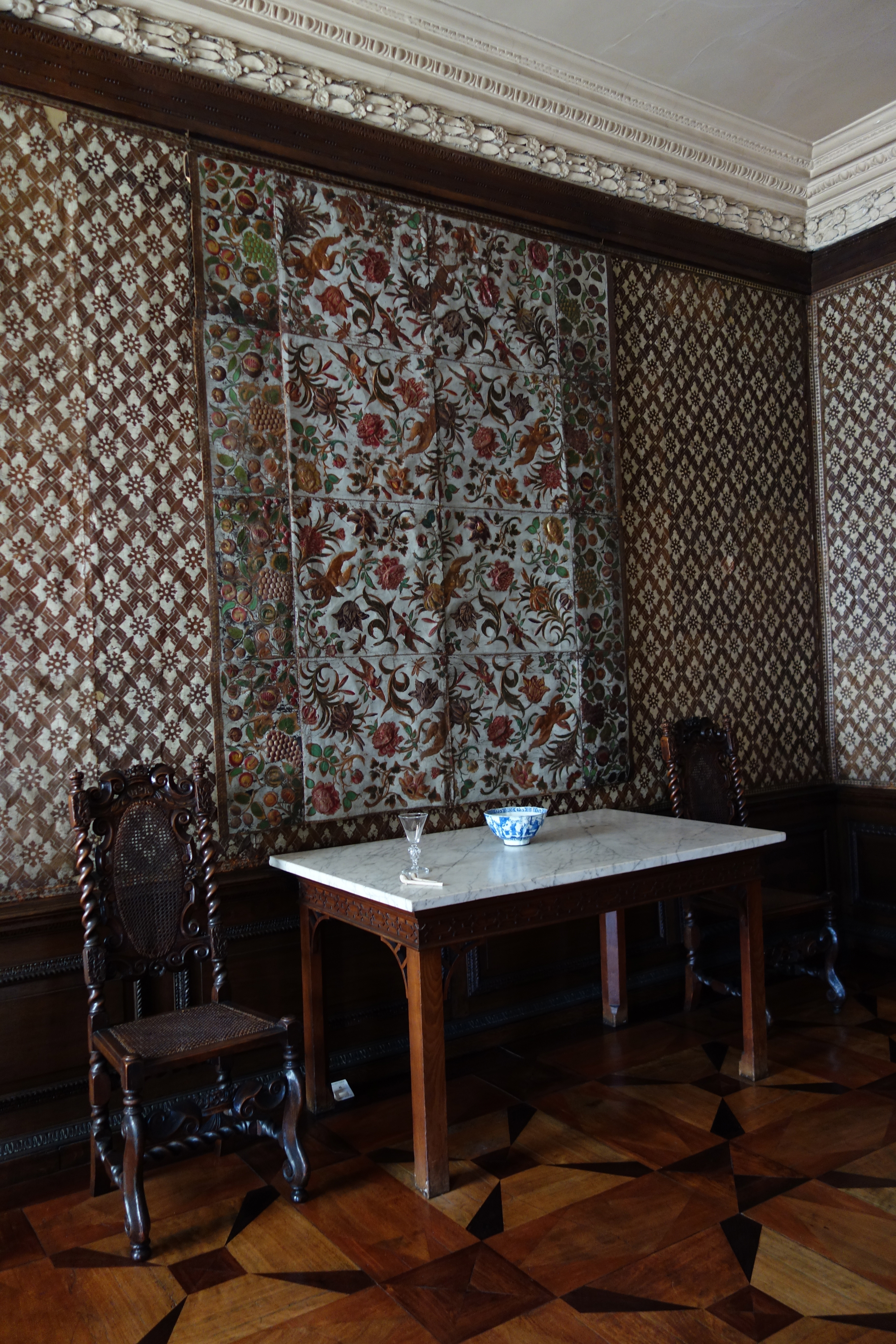 Where the wallpaper is made from leather, intricately cut.