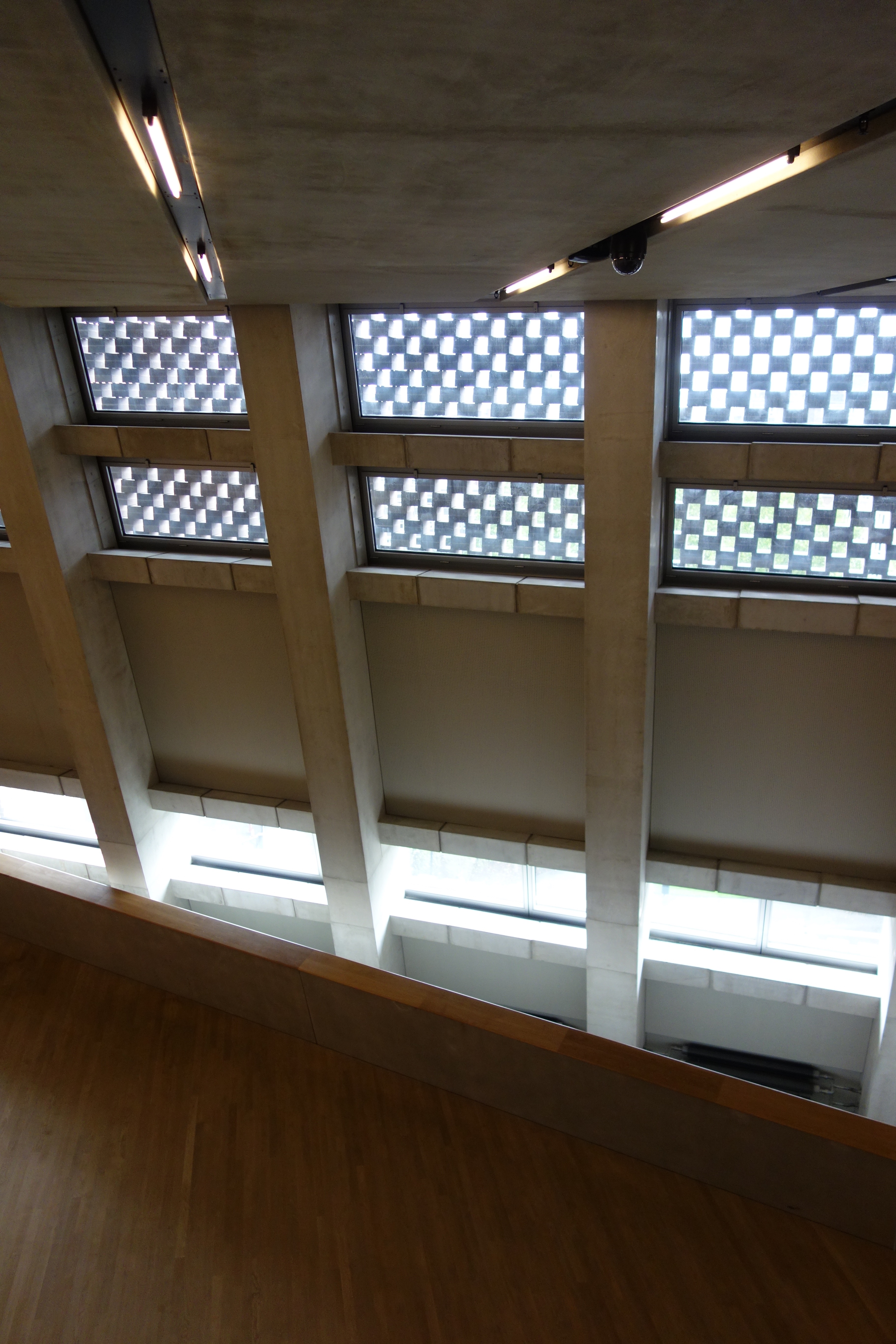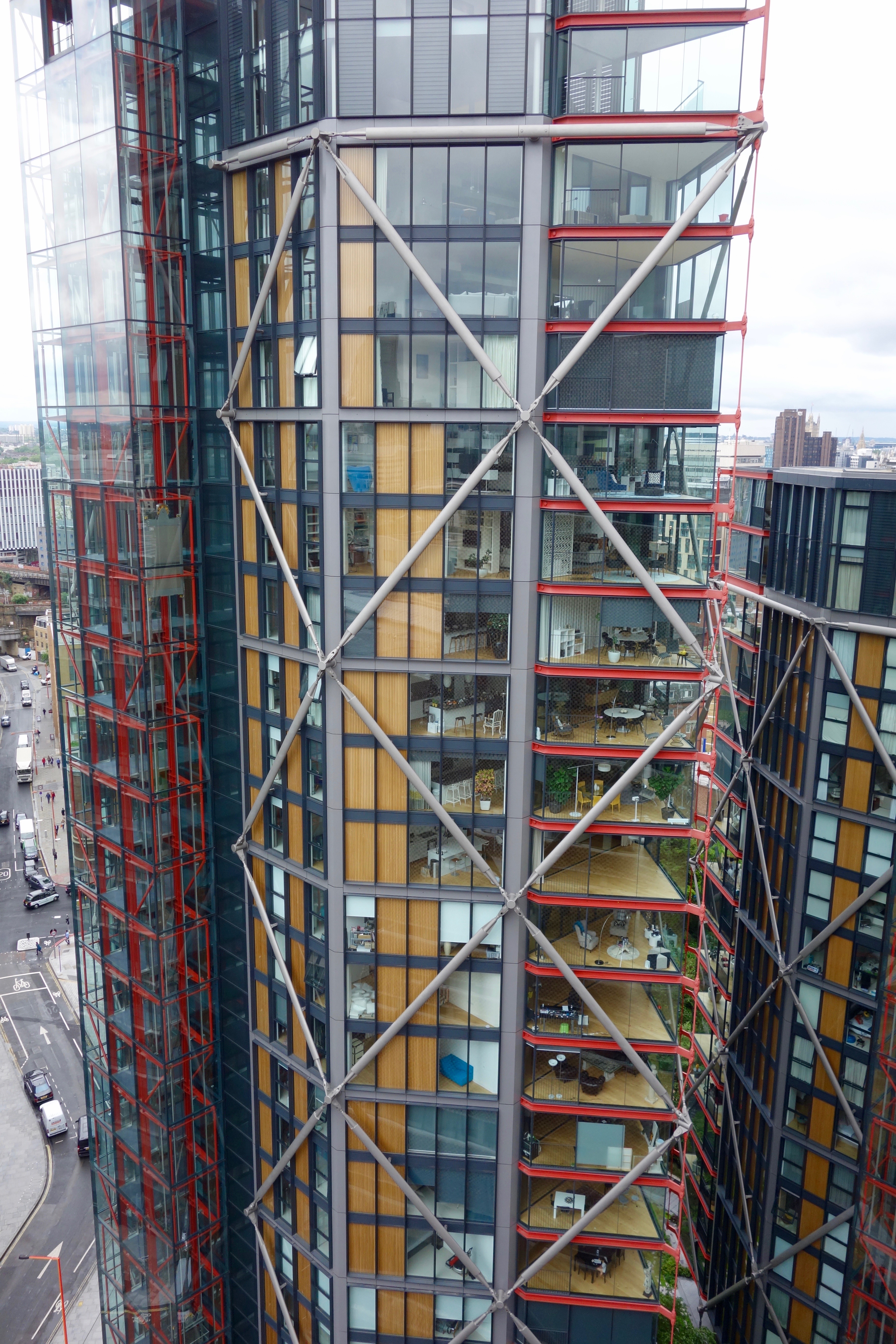 About the pointed sitting rooms; how the scale of them from this perspective makes it look like a giant doll house filled with miniature furniture; about the different bar stools in each kitchen, and the perfect spacing between these bar stools; who lives here; who cleans them; the apogee of window cleaning; pseudo-Centre Pompidou, elongated; and how seeing this makes me think of the film ‘Rear Window’.